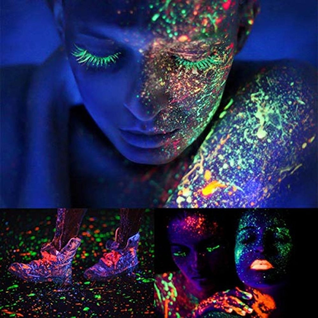 Perfect for glow parties, festivals and blacklight body art, this one-stop kit contains everything you need to create stunning UV Neon designs that glow fiercely under blacklight! Contains: 5 x Liquid Face Paints (Neon Pink, Neon Yellow, Neon Orange, Neon Green, Glow in the Dark), plus 1 Brush and 1 Sponge.